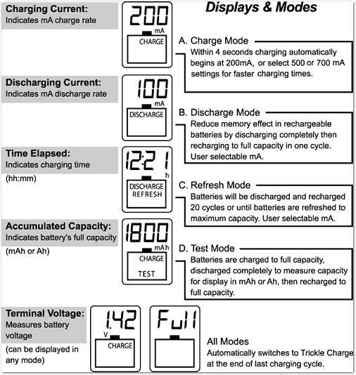 The BL700N offers four operating modes—Charge, Charge/Test, Discharge, and Discharge/Refresh—covering routine charging as well as deeper maintenance cycles. These functions make the charger suitable for everyday household use, as well as for users who want to track performance or extend the lifespan of their rechargeable batteries.